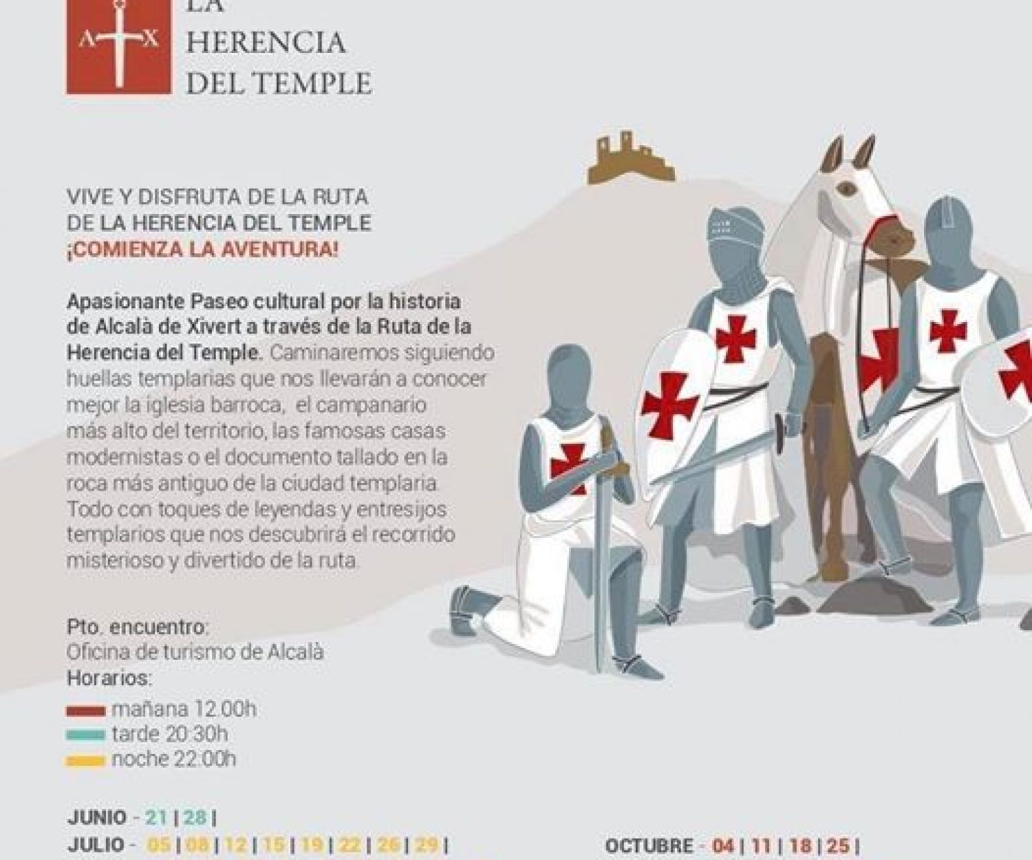 Noticias 11 Ago 2020 Vive y disfruta da la ruta «La herencia del temple» Un apasionante paseo cultural para disfrutar con la familia de la historia de Alcalà de Xivert. Caminaremos por las calles…